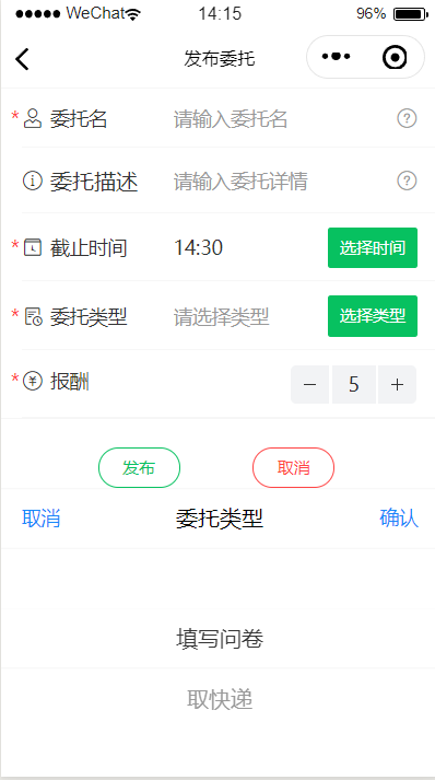 - 功能设想:显示委托信息,提供用户完成委托,取消委托,查看问卷,填写问卷的功能。